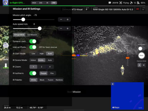Wir können heute mit Thermal-Drohnen Rettungseinsätze unterstützen, wie das früher nie möglich war. Sei es bei der Personen oder Rehkitzrettung, die Thermal-Drohnen haben vieles verändert. Die empfindlichen professionellen Thermal Kameras erlauben viel Einstellungen. Wichtige Einstellung sind die Isotherme, wo wir den Thermalbereich einschränken. Sei es für Menschen oder Tiere. Wir können die Farbbereiche auf 5° bis 45° einschränken, um noch einfacher Menschen oder Tiere zu finden. Wenn wir dann ein Rettungsobjekt gefunden haben können wir die Karten-Koordinaten via Airdrop/Whatsapp/Mail an die Sucher senden. Dieses Airdrop Format führt den Retter direkt an sein Ziel egal ob Google oder Apple Map. Leider gibt es das „bis jetzt“ nicht in DJI Pilot oder anderen APP‘s. Deshalb habe ich dazu mehrere APP‘s in iOS entwickelt. Diese APP hier ist gratis.- XT2 Matrice 200 und Matrice 300- XT S Matrice 200- H20T Matrice 300